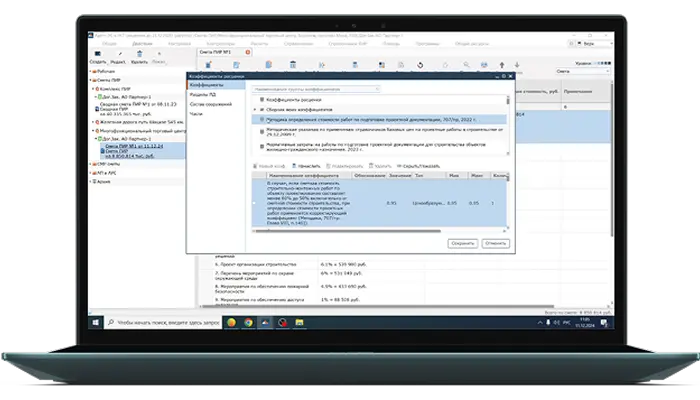 Учет дополнительных условий проектирования с помощью коэффициентов, которые применяются к: расценке в целом, разделам проектной документации (ПД), разделам сметы, итогам сметы в целом.